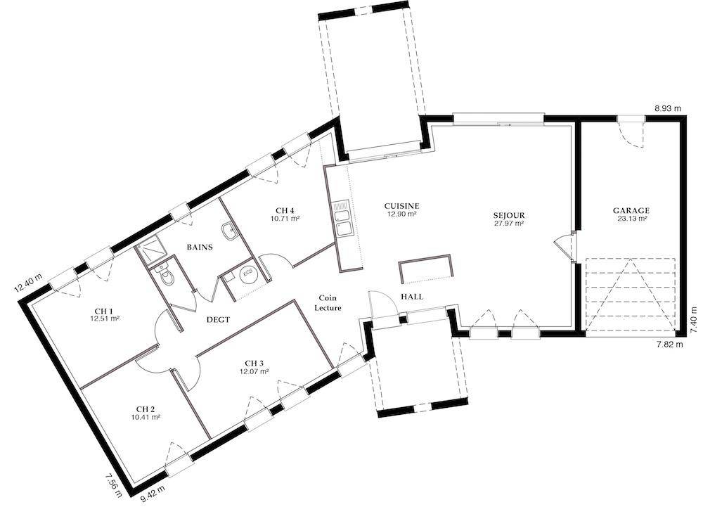 Cette maison de plain-pied se distingue par son architecture en V, permettant une séparation naturelle des espaces de vie et offrant une intimité préservée pour chacun de ses habitants. Elle comprend 4 chambres spacieuses et une pièce de vie centrale, véritable cœur de la maison, où la convivialité et le partage sont à l'honneur. Le garage intégré, pratique et esthétique, souligne l'aspect fonctionnel de cette demeure, tandis que le porche d'entrée accueille vos invités avec élégance et distinction.