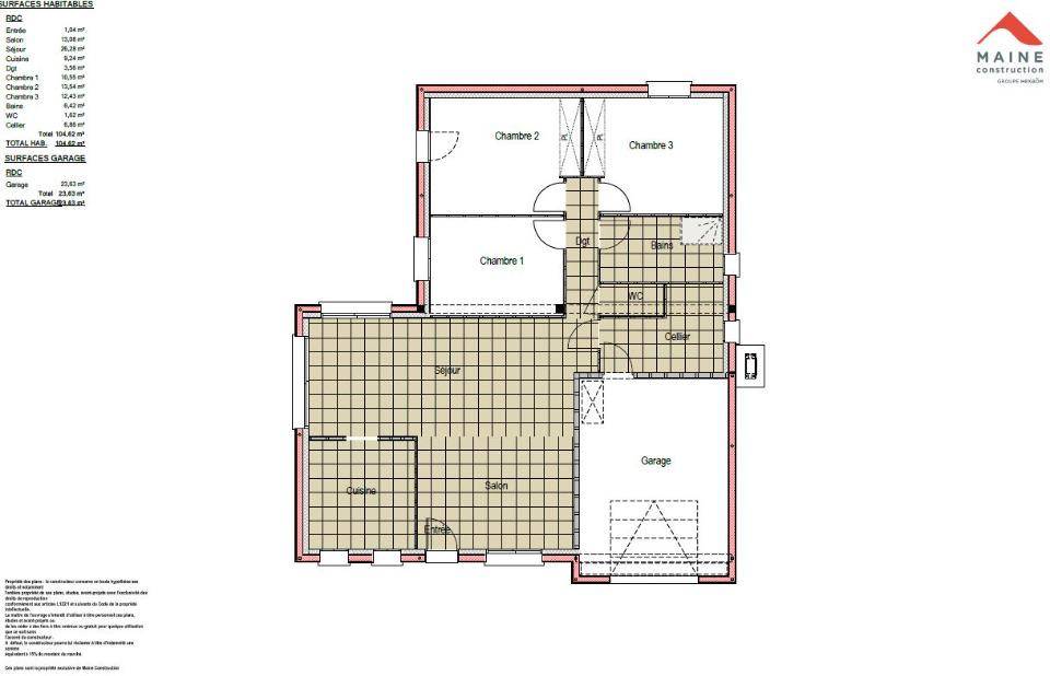 En vente : située à quelques kilomètres du Mans, votre agence Maine Construction Le Mans est heureuse de vous proposer cette maison de 4 pièces de plain-pied de 104 m², idéalement située dans Saint-Ouen-en-Belin (72220).