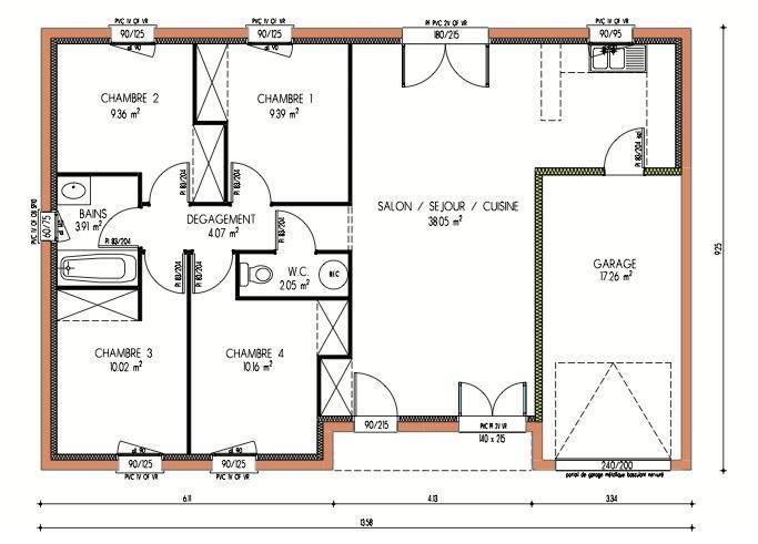 Elle offre quatre chambres, une cuisine et une salle de bains. La maison est neuve.