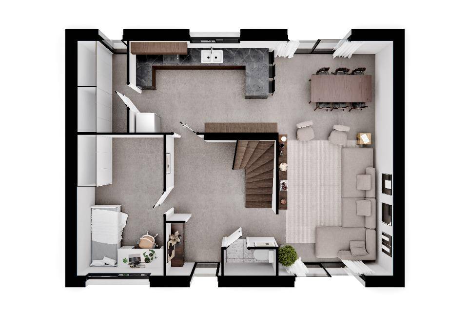 Le rez-de-chaussée propose une entrée accueillante, un bureau, un vaste séjour/salon avec accès direct à la cuisine et son cellier.