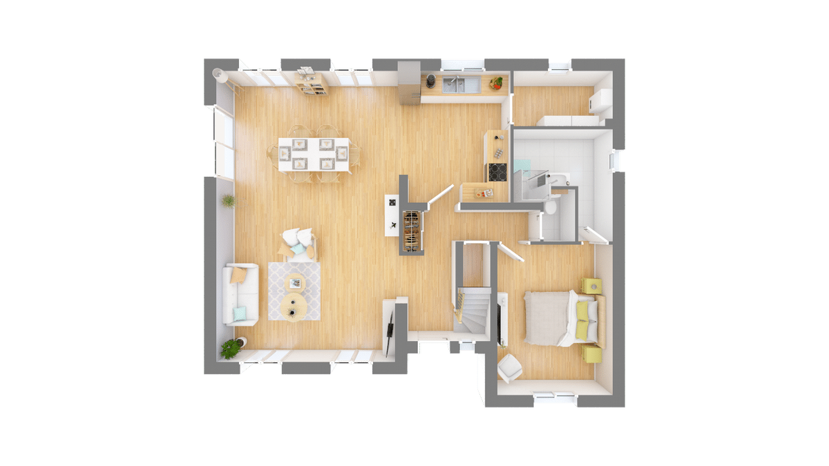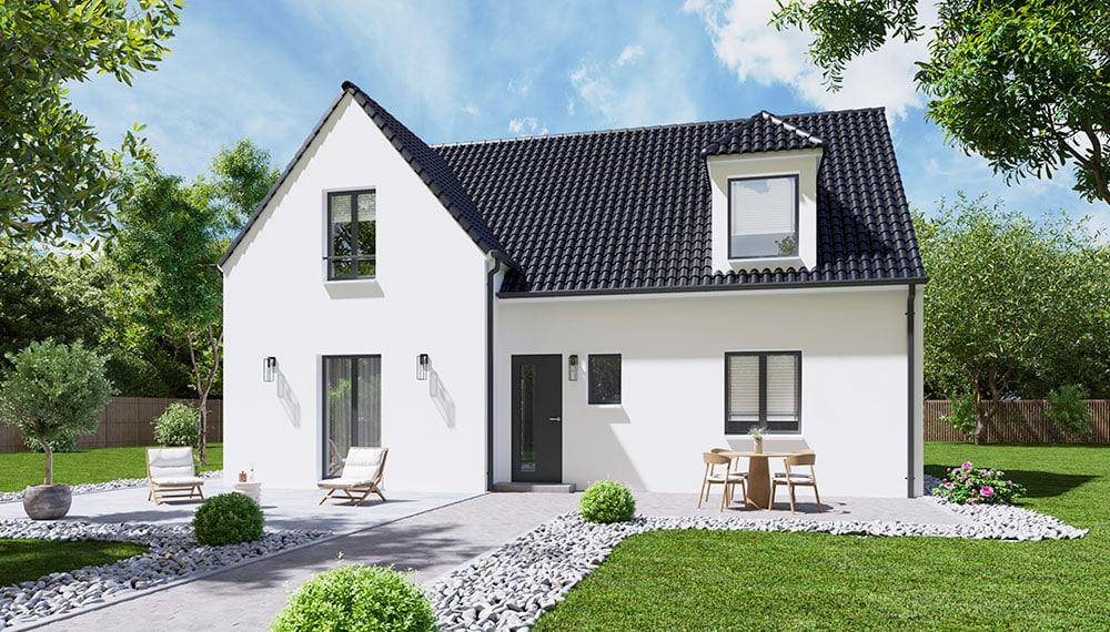 Cette grande maison familiale de 109 m² est spacieuse et fonctionnelle, avec une avancée en L qui lui confère caractère et prestige. La Hellière se distingue par sa façade avant traditionnelle et rythmée, agrémentée d'une fenêtre « plein cintre » et d'une lucarne, apportant une touche d'élégance et de luminosité.