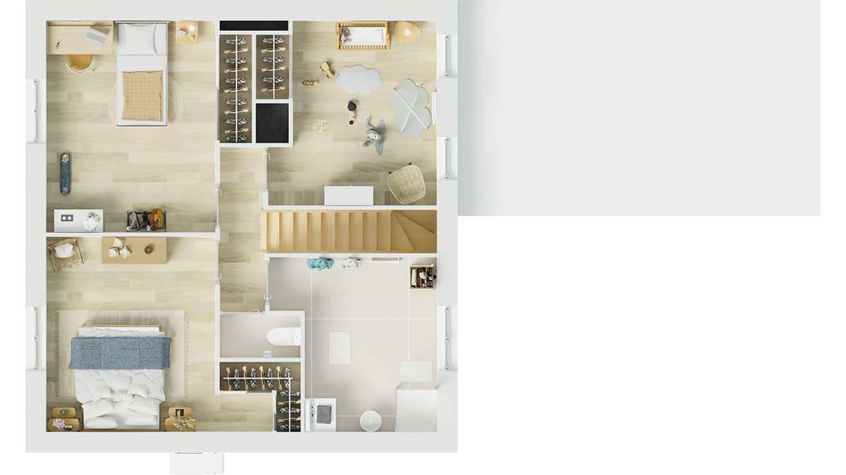 Sur ce terrain, nous vous proposons la maison Focus Urban 80, un modèle à étage compact et moderne parfaitement adapté aux parcelles urbaines. Avec ses 80 m² habitables, cette maison neuve offre une belle pièce de vie ouverte et lumineuse au rez-de-chaussée, trois chambres bien agencées à l'étage, ainsi qu’un garage intégré pour plus de confort au quotidien.