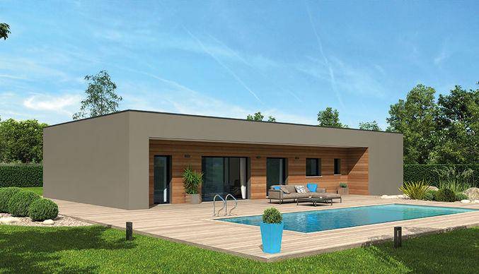 La maison Natimamba est un modèle contemporain de plain-pied avec un toit terrasse. Son allure résolument moderne saura séduire les amateurs de maison design. Son plan rectangulaire est divisé en deux parties : le coin jour avec un espace de vie comprenant séjour et cuisine entièrement ouvert avec un cellier et le coin nuit, quant à lui, est composé de chambres spacieuses et d'une belle salle de bain. Un garage accolé à la maison permettra d'abriter votre voiture et les affaires de votre famille.