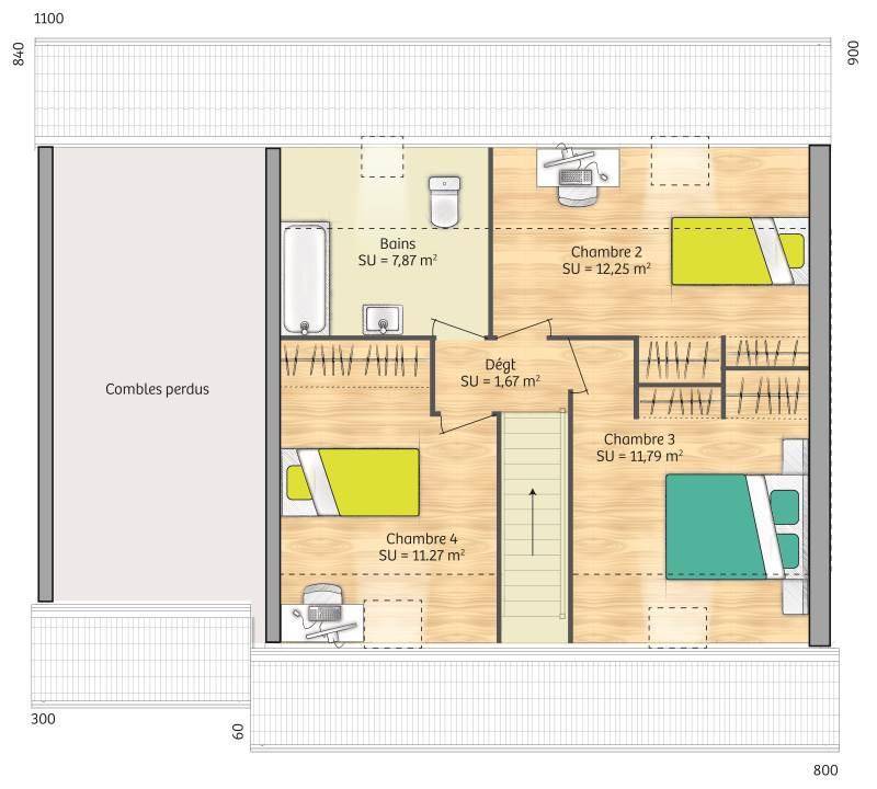 C'est une maison de 2 niveaux. Elle inclut quatre chambres, une cuisine et une salle de bains. La maison est neuve.