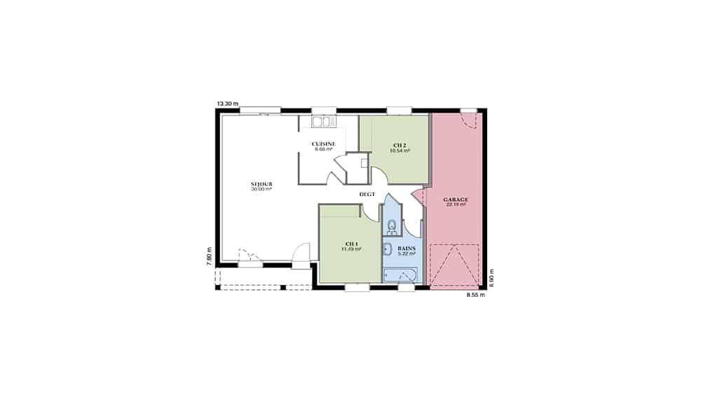 La "Ménilles" se distingue par son architecture soignée, disponible en versions à 2 ou 4 pans, selon vos préférences. Son design est complété par une longue galerie, ajoutant un espace de vie extérieur où vous pourrez profiter des beaux jours, ainsi qu'un garage accolé, assurant praticité et sécurité pour votre véhicule.