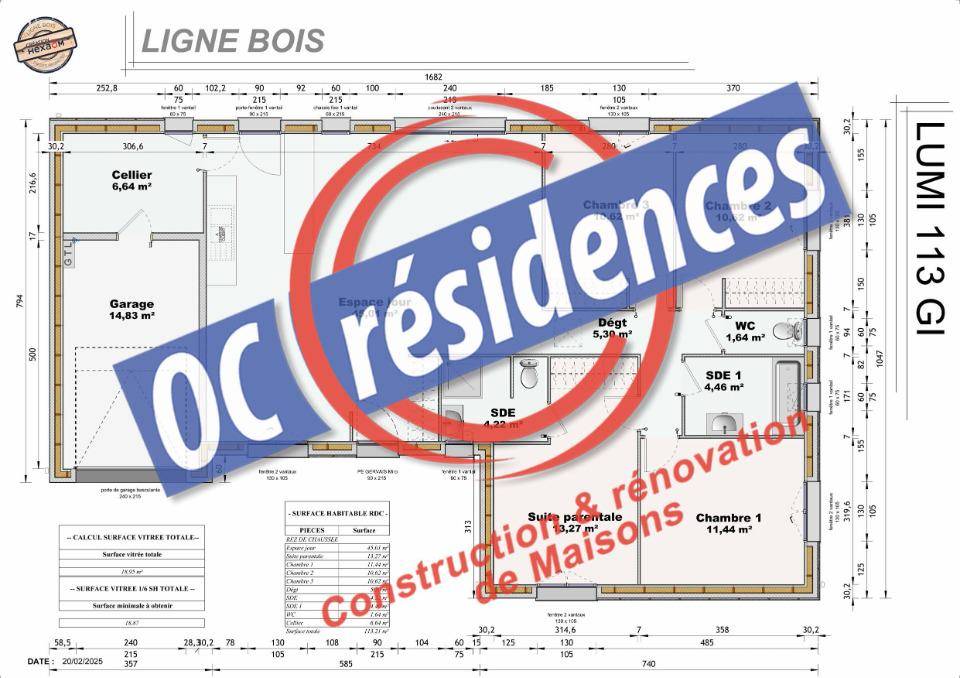 Ce plan de maison dévoile un agencement de plain-pied où la lumière naturelle circule librement, créant une atmosphère chaleureuse et accueillante. L'ossature bois, gage de confort et d'isolation, enveloppe les espaces de vie d'une douceur naturelle. La pièce de vie principale, d'une générosité remarquable avec ses 45,01 m², s'ouvre sur l'extérieur, invitant à la convivialité et au partage. Les trois chambres, conçues comme des havres de paix, offrent à chacun son espace d'intimité, tandis que la suite parentale, avec sa salle d'eau privative, promet un confort absolu.