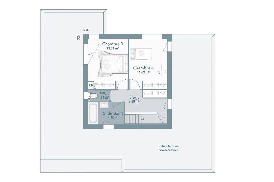 Cette maison comporte 2 niveaux. Elle comporte quatre chambres, une cuisine et deux salles de bains. La maison est neuve.