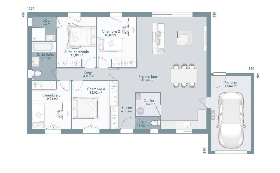 La ligne de maison Actua est conçue pour coller aux tendances actuelles ! Cette maison de plain-pied de 105 m² en RE2020 est faite astucieusement ! Jugez, vous-même : elle dispose d'une entrée avec son placard, d'une pièce de vie de plus de 40 m², d'un cellier et d'un garage en option. La pièce de vie comprend une jolie cuisine ouverte sur la salle à manger et le salon, un ensemble parfait pour apprécier l'espace et la lumière traversante. Pour la partie nuit, la composition de cette maison est aussi astucieuse : 3 chambres avec placards, une salle de bains mais aussi une suite parentale en option avec rangements et salle d'eau.