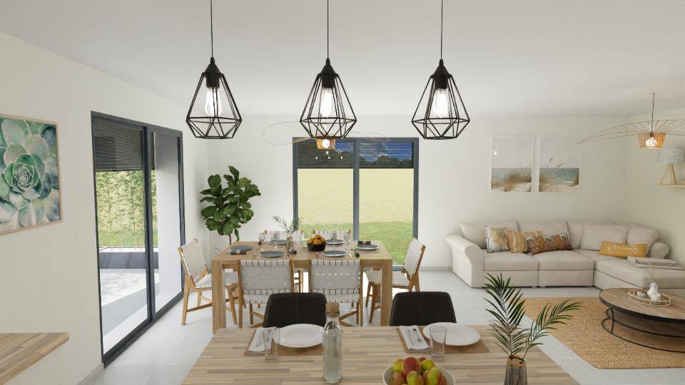 L'intérieur est composé de 3 chambres, d'une salle de bains, d'une cuisine ouverte sur une belle pièce de vie de plus de 45 m² avec un cellier attenant au garage en toit terrasse.