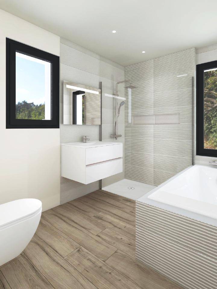 Toutes nos maisons sont livrées avec du carrelages 60 x 60 cm, 90 x 90 cm ou 120 x 120 cm, au sol dans toutes les pièces, sanitaires et faïences dans les pièces d'eau.