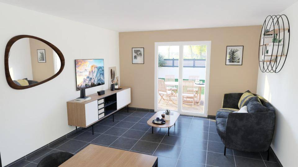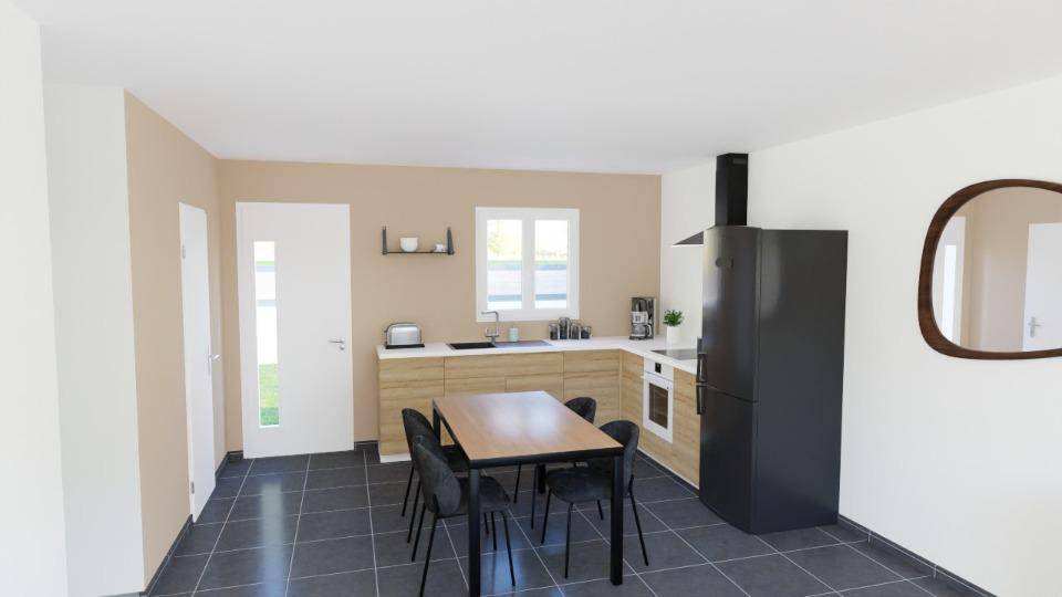 Nous avons pensé pour vous ce modèle plain pied type 4 de 64 m² composé d'une pièce de vie avec cuisine ouverte, 3 chambres, une salle de bain et un WC séparé.