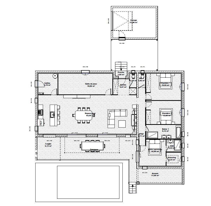Notre modèle se compose d'une grande salle de jeux, de 4 chambres, dont une suite parentale avec dressing et salle d'eau, offrant un grand espace de rangement pour vous simplifier la vie. Cet habitat de 157 m² habitable avec garage séparé de 21,66 m² réponds parfaitement à un mode de vie familial.