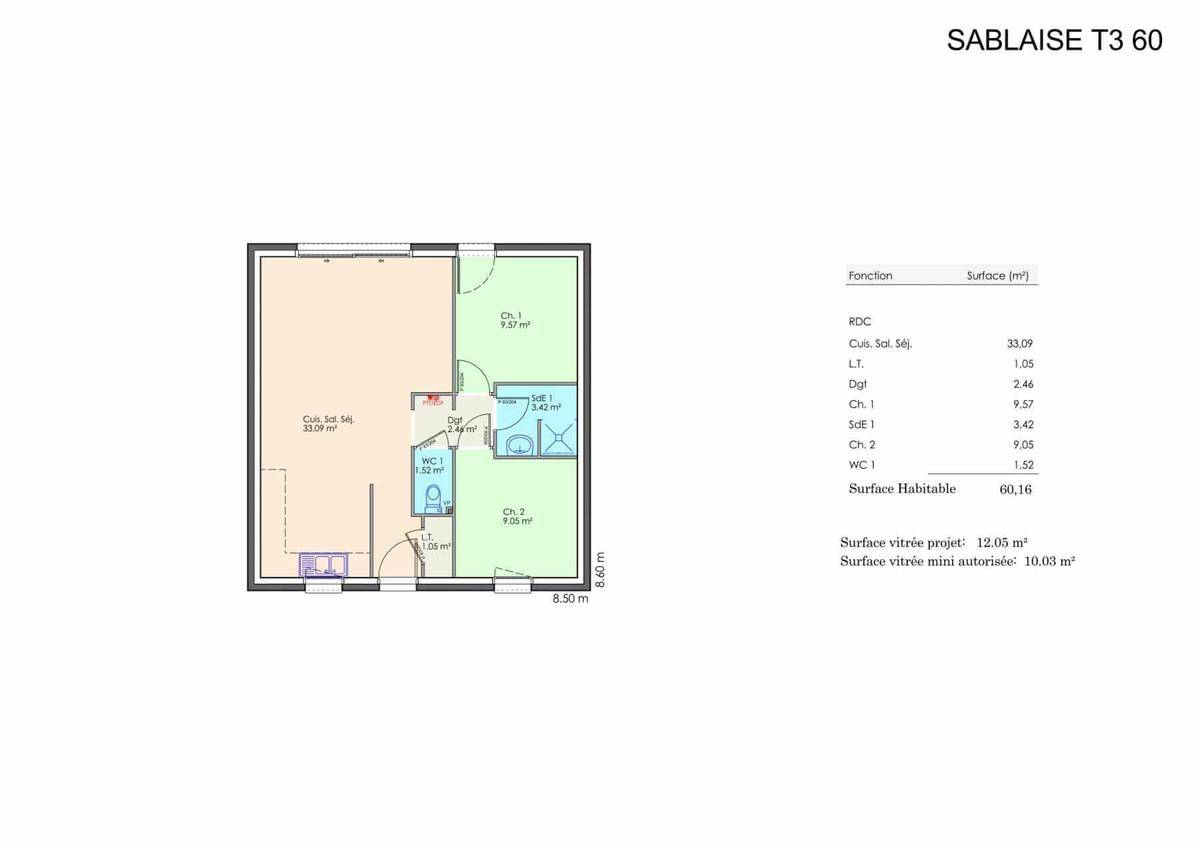 La disposition intérieure de la Sablaise en fait une habitation à la surface optimisée. Il n’y a aucune place perdue ! Vous disposerez de deux chambres, d’un grand séjour avec cuisine ouverte. La salle d’eau, équipée d'une douche italienne, se situe dans l’espace nuit et les w.c. sont séparés.