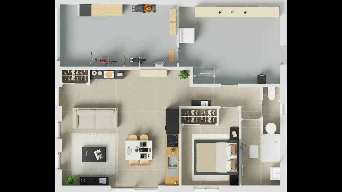 La conception de cette maison intègre dès le départ la possibilité d'évolution. Lorsque le moment sera venu d'agrandir, l'atelier actuel pourra être aménagé en une chambre avec salle d'eau ou dressing. Cette transformation est facilitée par une infrastructure prévue pour accueillir les installations sanitaires nécessaires. Cette flexibilité permet d'adapter la maison à l'évolution de votre famille ou de vos besoins sans compromis sur le confort ou la qualité de vie.