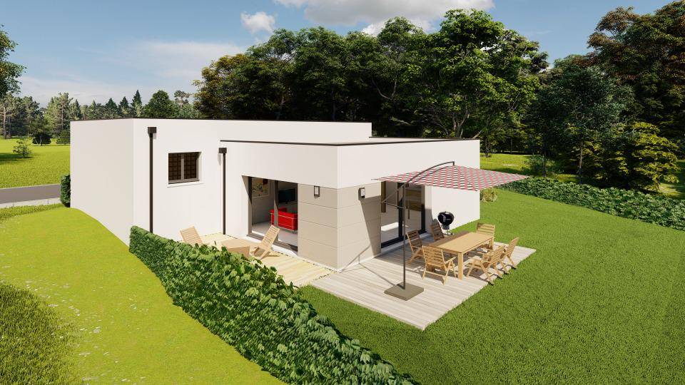 Conçue de plain-pied, elle propose trois chambres, une cuisine et une salle de bains. Cette maison est neuve.
