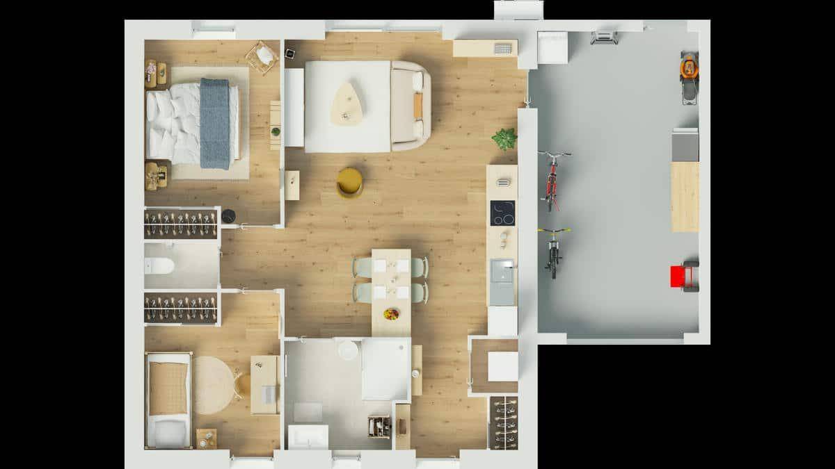 Sur ce terrain, nous vous proposons cette maison de plain-pied au design contemporain, idéale pour un confort de vie au quotidien. Ses deux chambres offrent un espace nuit cosy, tandis que la vaste pièce de vie de plus de 35 m² réunit cuisine ouverte, salle à manger et salon, baignés de lumière naturelle. Vous profiterez également d’une salle d’eau moderne et d’un WC indépendant, pensés pour simplifier votre quotidien.