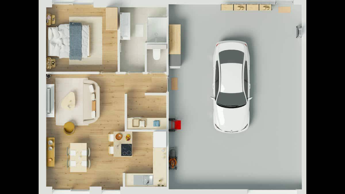 Adossé à la maison, un garage de presque 58m² représente bien plus qu’un simple espace de stationnement. Conçu pour évoluer, il peut être transformé en un véritable espace de vie supplémentaire. En fonction de vos besoins, cet espace pourra accueillir jusqu'à trois chambres et une seconde salle d’eau, apportant ainsi une solution idéale pour agrandir votre maison sans contrainte majeure.