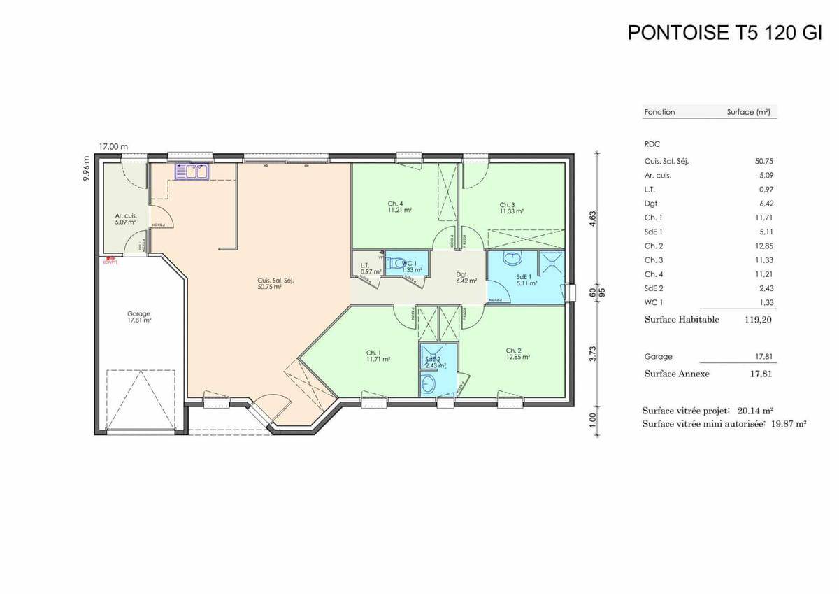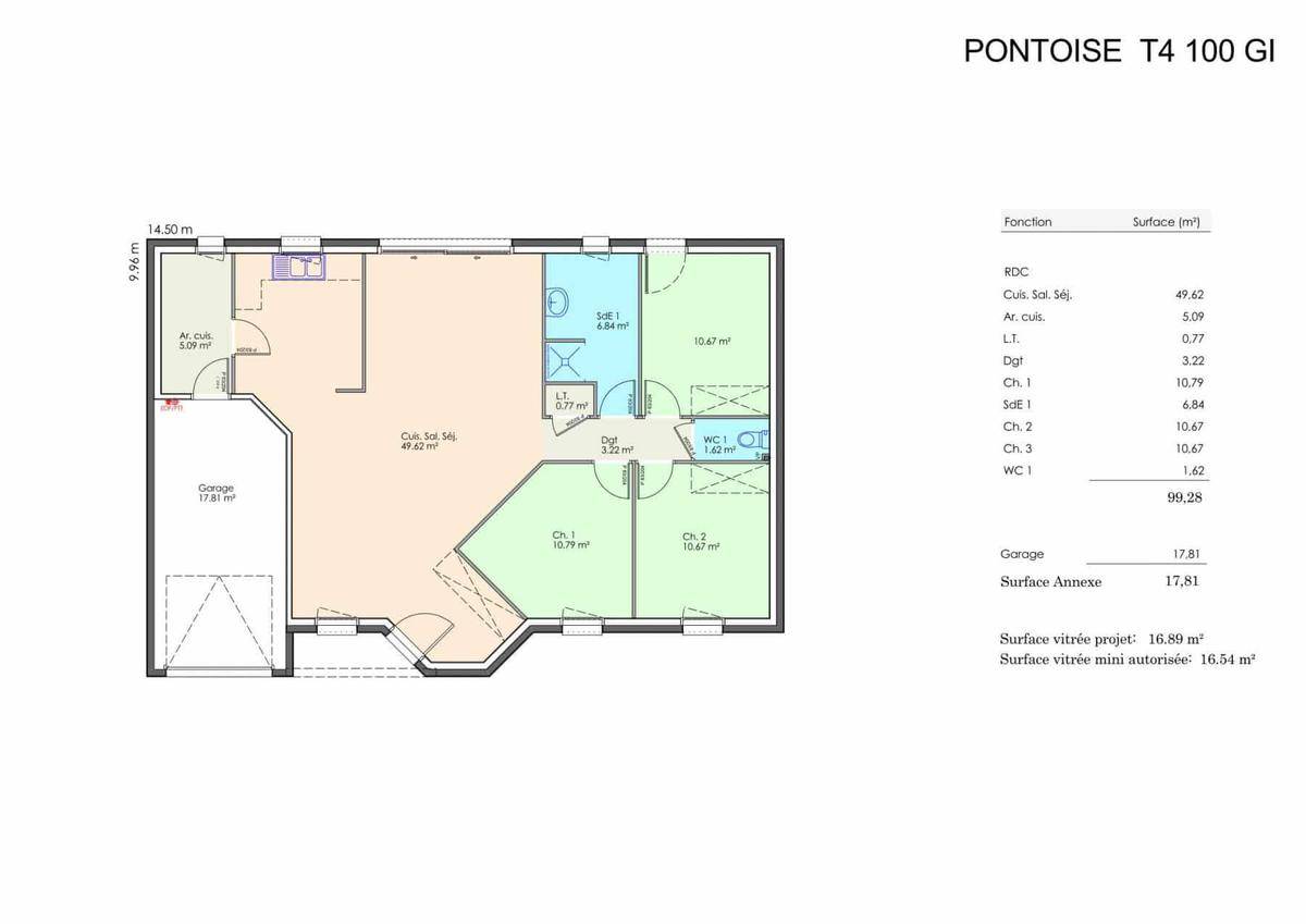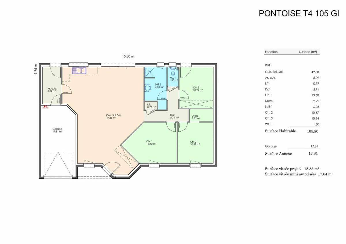 Sur ce terrain, nous vous proposons cette maison neuve : la Pontoise, une grande maison qui offre charme et confort. Ce modèle traditionnel de 120 m² est idéal pour une famille, avec ses 4 chambres et ses 4 pièces. La Pontoise se distingue par ses grands volumes et son organisation intelligente, où les espaces jour et nuit sont bien délimités.
