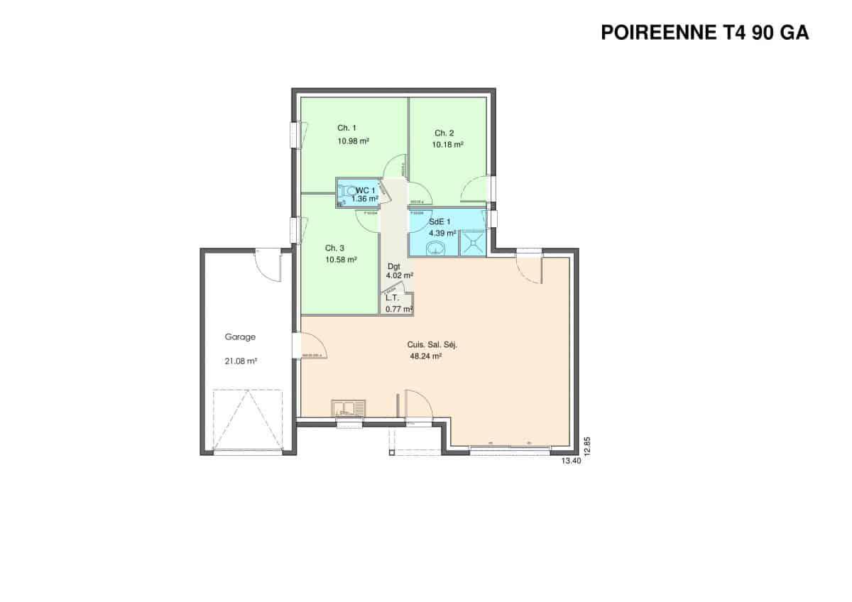 Avec une surface de 90 m², cette maison dispose de 3 chambres et de 4 pièces. La Poiréenne se distingue par son plan en T, offrant une distribution confortable et originale. Vous profiterez au maximum de l'espace disponible de la profondeur de votre terrain. Les chambres sont réunies autour d’un dégagement qui comprend également la salle d’eau avec une douche italienne et des WC séparés. Côté jour, la Poiréenne vous propose un salon-séjour avec cuisine semi-ouverte, communiquant avec le garage.
