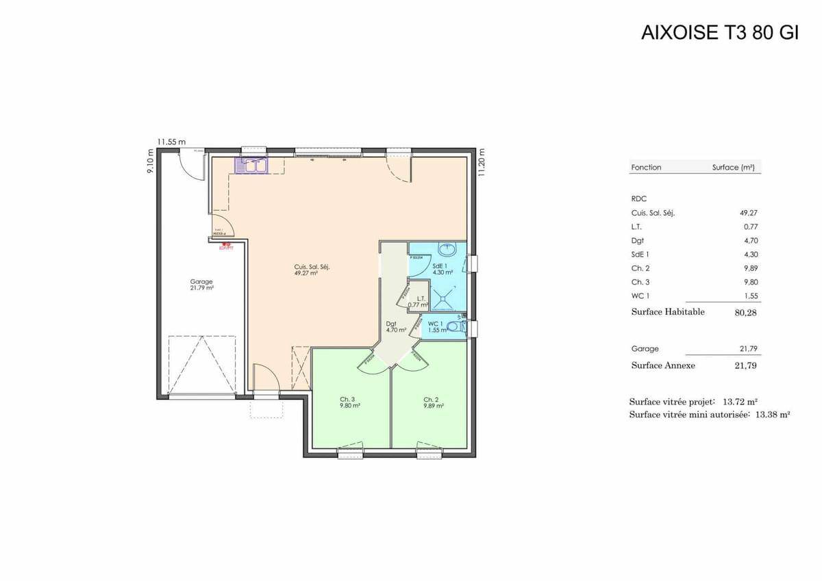 Sur ce terrain, nous vous proposons cette maison neuve : l'Aixoise, un coquet pavillon familial de plain-pied. Disponible en T3 sur une superficie de 80 m², l'Aixoise est une jolie maison traditionnelle qui saura répondre à toutes vos attentes.