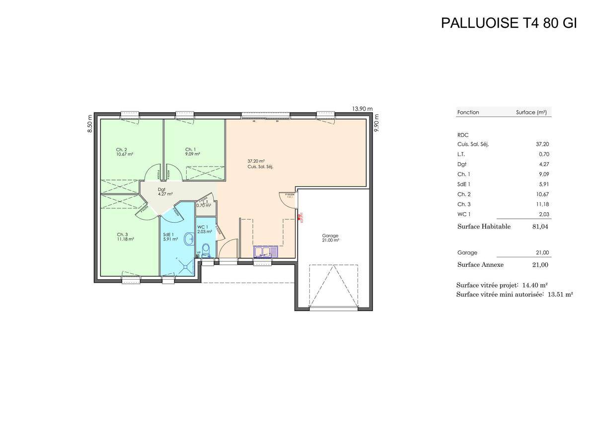 Sur ce terrain, nous vous proposons cette maison neuve : la Palluoise, une maison familiale qui s’adapte parfaitement à vos besoins. Avec une surface de 80 m², cette maison dispose de 3 chambres et de 4 pièces, offrant un espace de vie confortable et fonctionnel pour toute la famille.