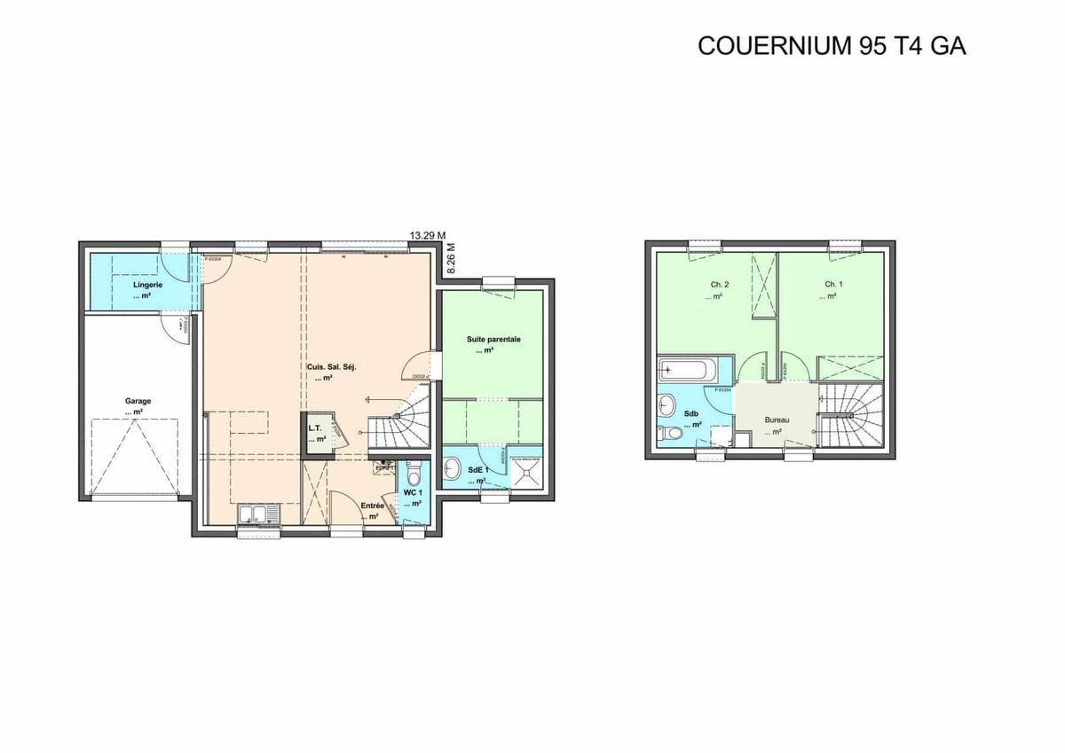 La Couernium est une maison contemporaine qui mêle toit à deux pentes et toiture terrasse. Cette construction offre une disposition intérieure modulable et intéressante. Déclinable en versions d’une superficie de 75 à 95 m², la Couernium vous offrira un look différent en fonction de vos choix. L’étage dans les différentes configurations se composera de deux chambres, d'une salle de bain avec baignoire, douche et WC. La version qui vous est ici présentée fait 90m² avec 3 chambres.