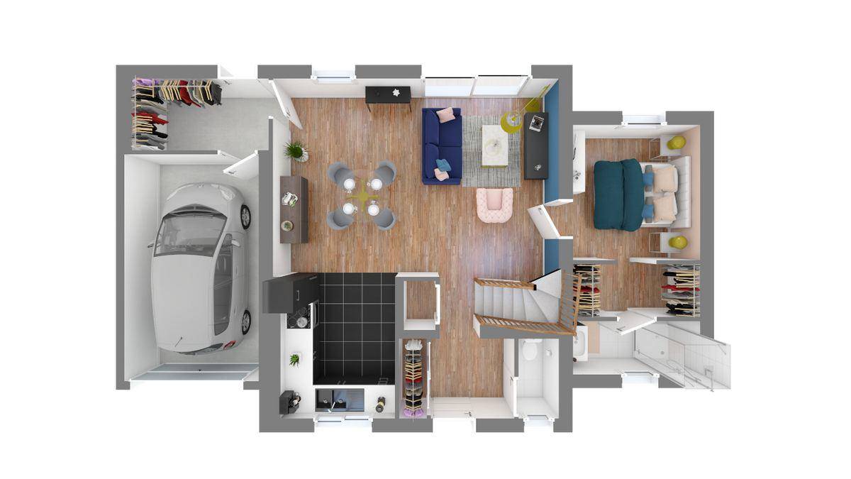 Tout se joue au rez-de-chaussée ! Si la partie centrale reste elle aussi identique, offrant un grand séjour-salon avec cuisine ouverte et un confortable hall d'entrée, le modèle intermédiaire proposera une suite parentale accolée avec dressing et salle d’eau. Cette maison peut également s'équiper d’un garage accolé et d’une lingerie très pratique.