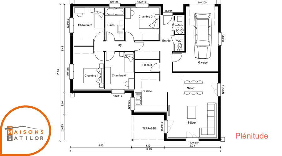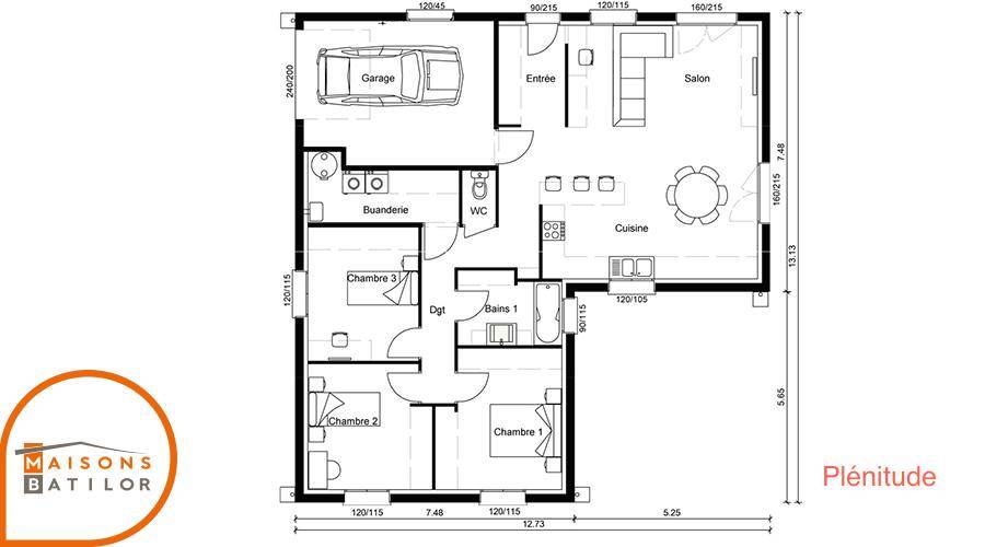 La Plénitude se distingue par son architecture en L, permettant une distinction naturelle entre l'espace jour et l'espace nuit, tout en restant sur un plan de plain-pied pour un confort optimal. Ce modèle comprend 4 chambres spacieuses, promettant intimité et tranquillité pour chaque membre de la famille, ainsi que 4 pièces bien agencées pour maximiser l'espace de vie commun.