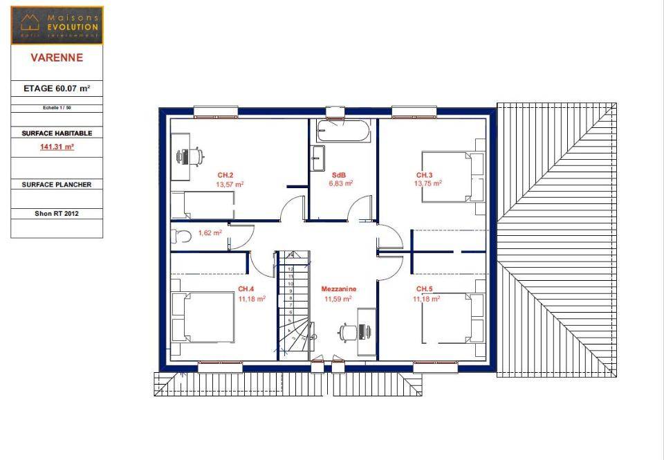 La Varenne est un modèle de maison en R+1 au toit 4 pans. Son parement à l'entrée lui confère un style contemporain. Elle vous offre une surface habitable de 141 m².