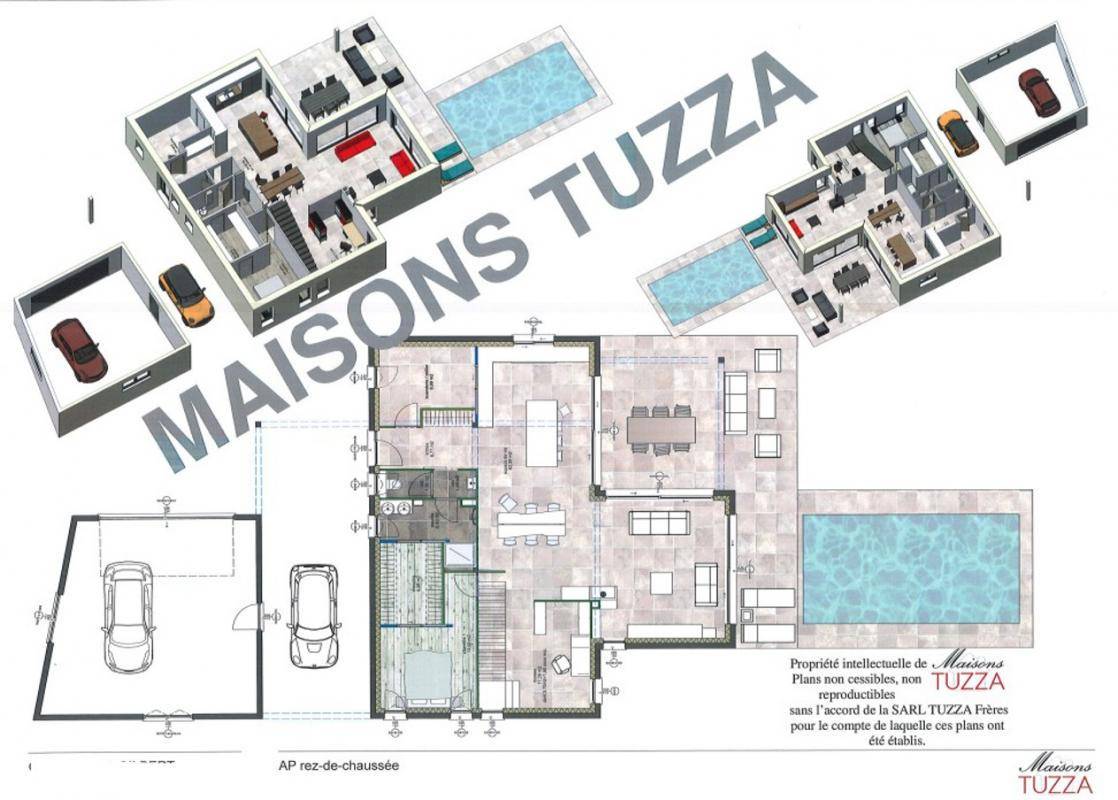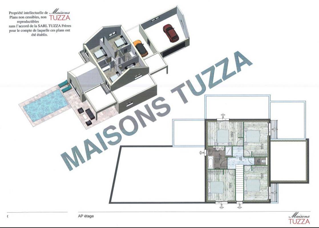 Proposition du visuel d'implantation d'une maison Tuzza de 200 m 2 composée de 5 chambres, 1 buanderie 1 bureau , garage, terrasse et piscine.