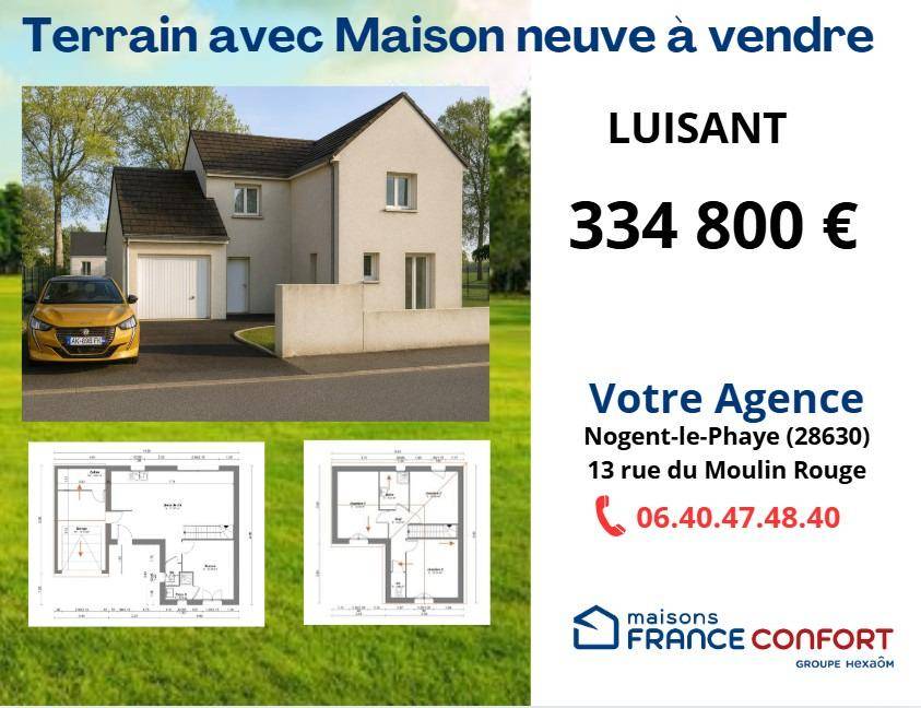 TERRAINMaison neuve à construire à Luisant (28600) – 94 m² habitables sur terrain de 500 m²Venez découvrir ce projet de construction sur-mesure situé à Luisant, dans un secteur résidentiel prisé, à seulement quelques minutes de Chartres.Profitez d’un cadre de vie paisible, proche des commerces, écoles et transports, tout en bénéficiant d’une maison moderne, performante et économe en énergie.Cette maison à construire offre une surface habitable de 94 m², parfaitement agencée pour allier confort et fonctionnalité :Au rez-de-chaussée :Une spacieuse pièce de vie baignée de lumière avec cuisine ouverte sur le salon/séjour, idéale pour recevoir et partager.Une chambre parentale avec accès direct à une salle d’eau privative, offrant un vrai confort de plain-pied.Un garage attenant et un cellier pour plus de praticité.À l’étage :Trois belles chambres avec rangements possibles.Une salle de bains familiale et un WC séparé.Le tout sur un beau terrain plat et viabilisé de 500 m², offrant un espace extérieur agréable pour vos futures terrasses, jeux d’enfants ou jardin paysager.Caractéristiques techniques :Construction neuve conforme à la réglementation RE 2020Isolation thermique et phonique renforcéeMenuiseries PVC double vitrageChauffage économique (selon étude thermique personnalisée)Personnalisation complète des plans et finitionsSon prix de vente est de 334 800 €. N’hésitez pas à prendre contact avec notre agence (Orlando PINTO BARRETO : (Numéro supprimé)) pour obtenir de plus amples renseignements sur ce terrain ou sur les démarches à suivre. Maisons France Confort Nogent-le-Phaye est là pour vous accompagner à toutes les étapes de l’achat.Annonce proposée par un Agent Commercial Partenaire.