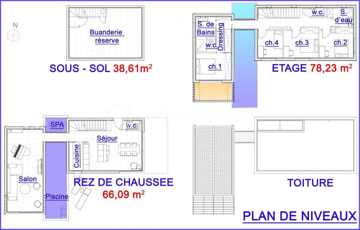 Surface habitable totale : 183 m², répartis comme suit : 39 m² au niveau -1, 66 m² au rez-de-chaussée et 78 m² à l'étage.